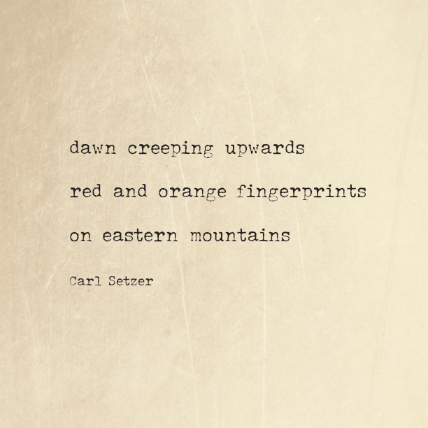 Friday Morning Haiku Posted on November 22, 2019 by Carl Setzer dawn creeping upwards red and orange fingerprints on eastern mountains Share this: Click to share on X (Opens in new window) X Click to share on Facebook (Opens in new window) Facebook Click to share on Tumblr (Opens in new window) Tumblr Click to share on Pinterest (Opens in new window) Pinterest Click to share on Reddit (Opens in new window) Reddit Like Loading... Related Published by Carl Setzer Writing haiku trying to figure out life View all posts by Carl Setzer