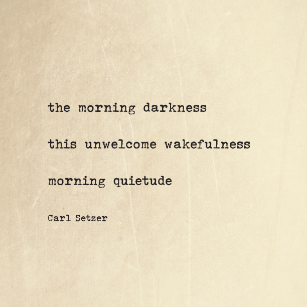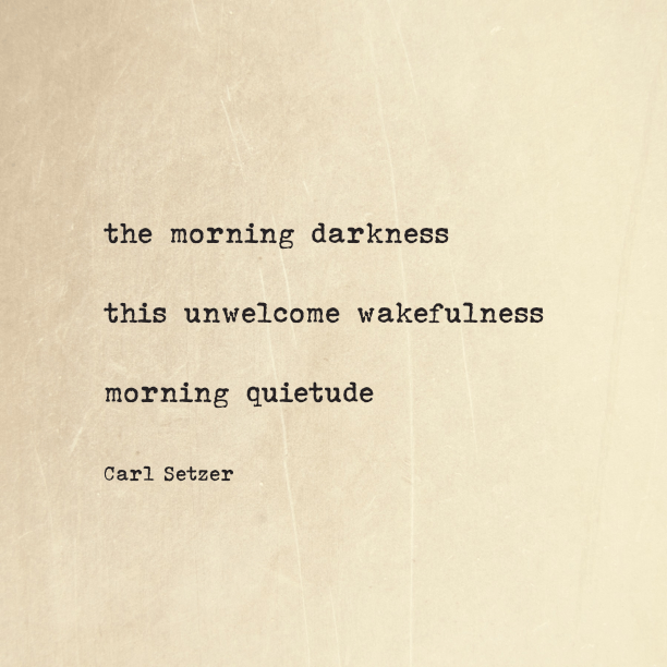 Monday Morning Haiku, December 16, 2019 Posted on December 16, 2019 by Carl Setzer the morning darkness this unwelcome wakefulness morning quietude Share this: Click to share on X (Opens in new window) X Click to share on Facebook (Opens in new window) Facebook Click to share on Tumblr (Opens in new window) Tumblr Click to share on Pinterest (Opens in new window) Pinterest Click to share on Reddit (Opens in new window) Reddit Like Loading... Related Published by Carl Setzer Writing haiku trying to figure out life View all posts by Carl Setzer