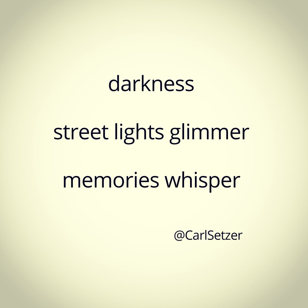 An Early Morning Haiku Posted on January 25, 2020January 25, 2020 by Carl Setzer darknessstreet lights glimmermemories whisper Share this: Click to share on X (Opens in new window) X Click to share on Facebook (Opens in new window) Facebook Click to share on Tumblr (Opens in new window) Tumblr Click to share on Pinterest (Opens in new window) Pinterest Click to share on Reddit (Opens in new window) Reddit Like Loading... Related Published by Carl Setzer Writing haiku trying to figure out life View all posts by Carl Setzer