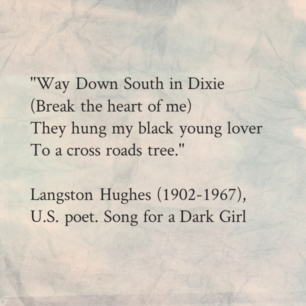 You’re welcome, Carl. But I am not adding to the poem. I simply provided the full poem which matters. The full context matters. Have you never listened to Billie’s “Strange Fruit” before? I think U will find it truly profound. I believe it was a white jewish man who wrote the lyrics… but please don’t quote me on that. I need to fact check that. But it’s her voice and version of the song that seems to both haunt and live on in order to express the horror. Langston Hughes was pointing out the white supremacy he lived thru… not so much his true love… in his poems and your black history NEEDS to reflect that truth. U gotta show the whole poem to speak to it. “White Jesus” is not all inclusive… even if Jesus is Love, right? Talk about Langston Hughes for reals. Give him the credit he id due.