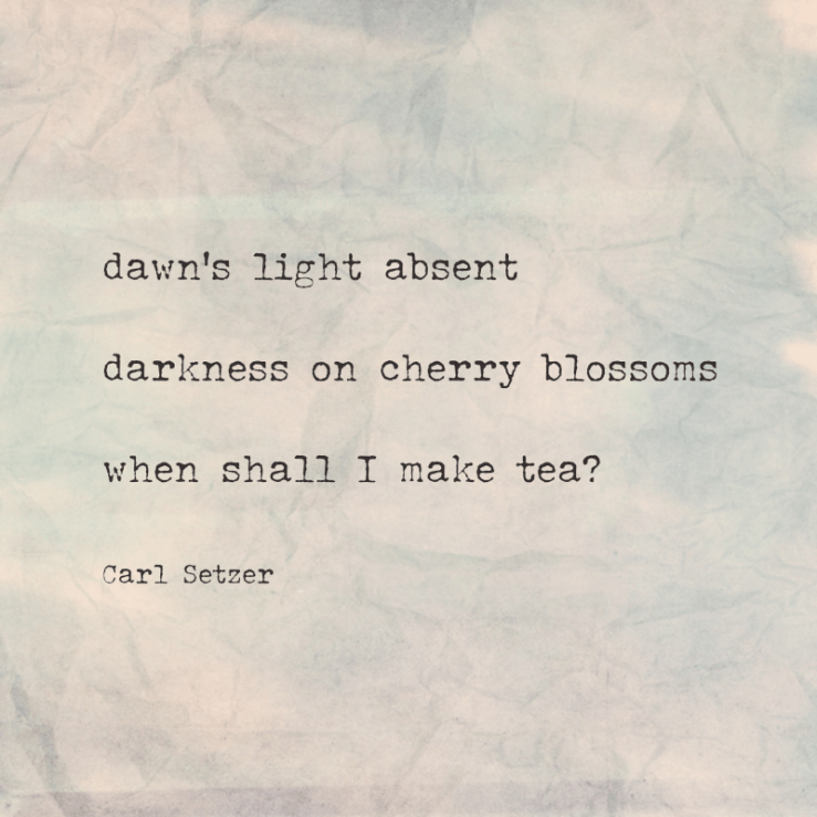 Day Two: NaPoWriMo Posted on April 2, 2020 by Carl Setzer dawn’s light absent darkness on cherry blossoms when shall I make tea? I appreciate every motivation to write. NaPoWriMo’s goal of a poem a day fits what I’m trying to do with this blog. I hope you enjoy! Share this: Click to share on X (Opens in new window) X Click to share on Facebook (Opens in new window) Facebook Click to share on Tumblr (Opens in new window) Tumblr Click to share on Pinterest (Opens in new window) Pinterest Click to share on Reddit (Opens in new window) Reddit Like Loading... Related Published by Carl Setzer Writing haiku trying to figure out life View all posts by Carl Setzer
