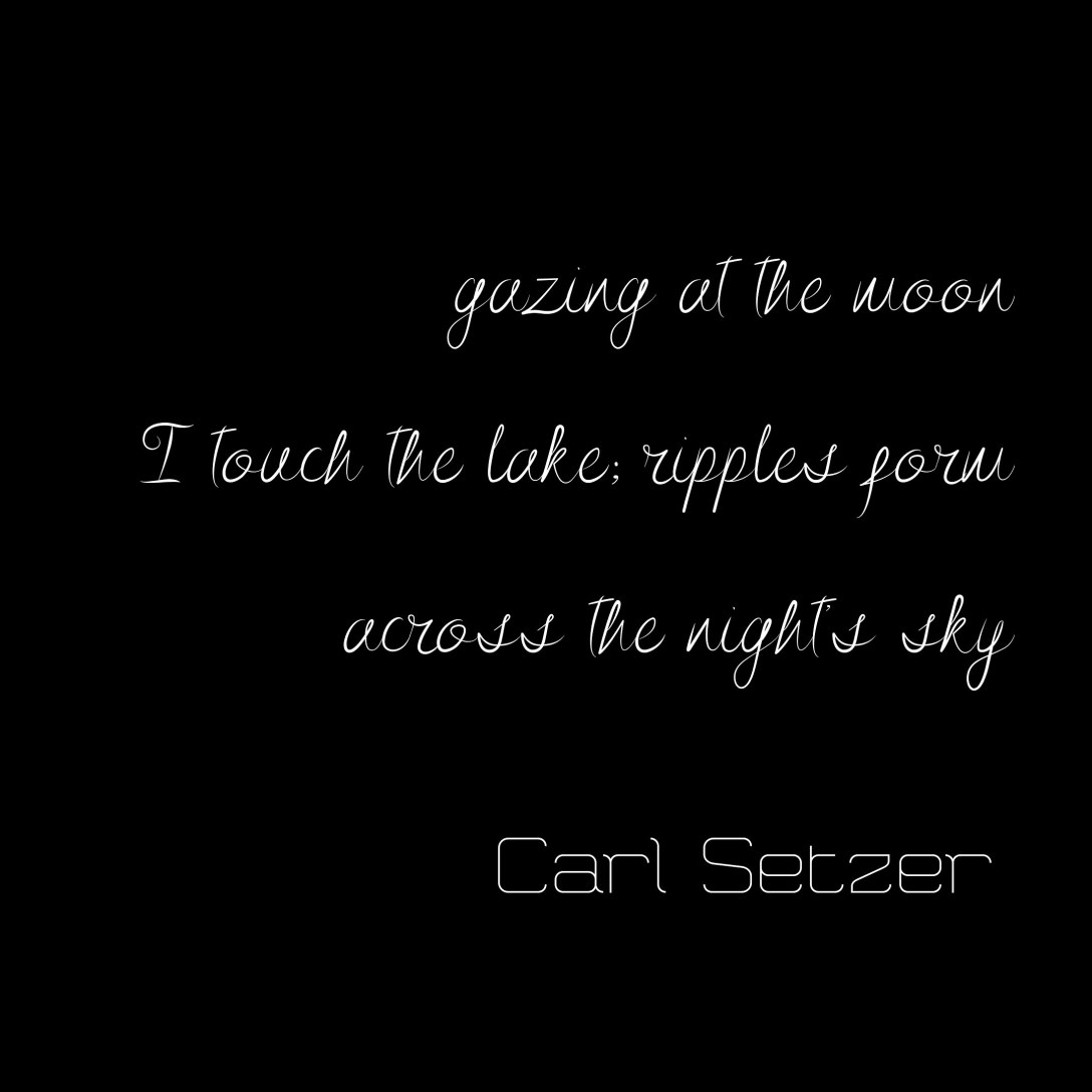 Posted on April 28, 2020 by Carl Setzer gazing at the moon I touch the lake; ripples form across the night’s sky Share this: Click to share on X (Opens in new window) X Click to share on Facebook (Opens in new window) Facebook Click to share on Tumblr (Opens in new window) Tumblr Click to share on Pinterest (Opens in new window) Pinterest Click to share on Reddit (Opens in new window) Reddit Like Loading... Related Published by Carl Setzer Writing haiku trying to figure out life View all posts by Carl Setzer