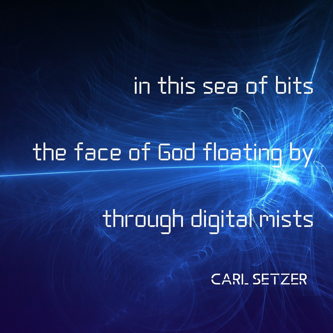 A Sea Of Bits Posted on May 17, 2020 by Carl Setzer in this sea of bits the face of God floating by through digital mists Share this: Click to share on X (Opens in new window) X Click to share on Facebook (Opens in new window) Facebook Click to share on Tumblr (Opens in new window) Tumblr Click to share on Pinterest (Opens in new window) Pinterest Click to share on Reddit (Opens in new window) Reddit Like Loading... Related Published by Carl Setzer Writing haiku trying to figure out life View all posts by Carl Setzer