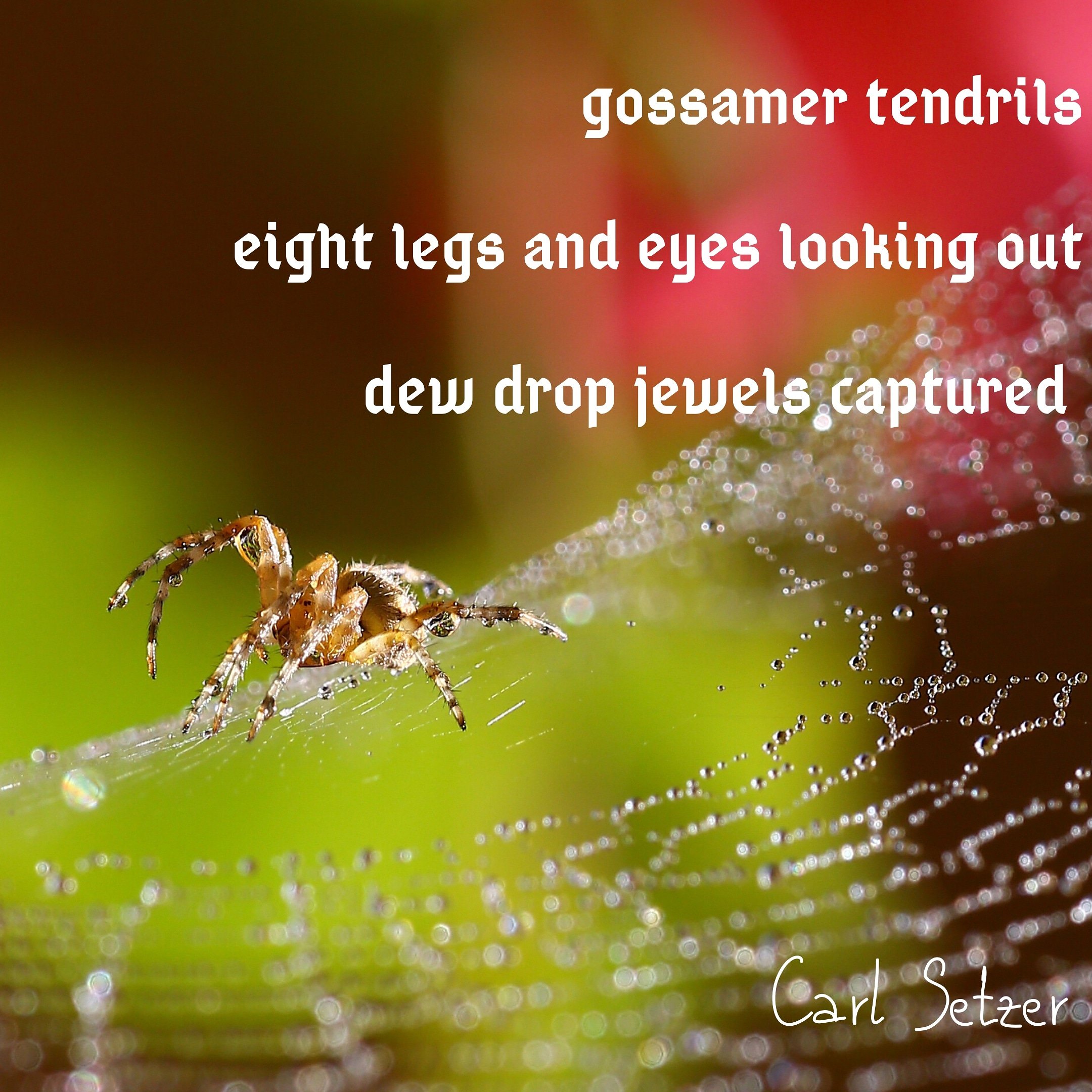 This Morning’s Haiku : Gossamer Tendrils Posted on June 28, 2020 by Carl Setzer gossamer tendrils eight legs and eyes looking out dew drop jewels capture Share this: Click to share on X (Opens in new window) X Click to share on Facebook (Opens in new window) Facebook Click to share on Tumblr (Opens in new window) Tumblr Click to share on Pinterest (Opens in new window) Pinterest Click to share on Reddit (Opens in new window) Reddit Like Loading... Related Published by Carl Setzer Writing haiku trying to figure out life View all posts by Carl Setzer