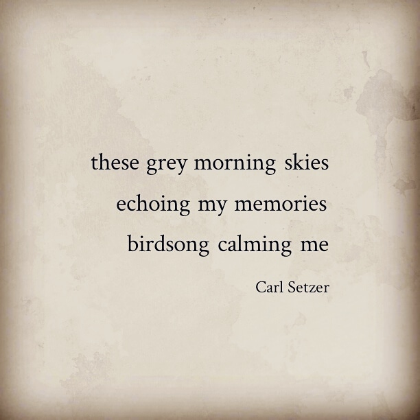 A Friday Morning Haiku Near Seattle Posted on July 10, 2020 by Carl Setzer these grey morning skies echoing my memories birdsong calming me These grey, cloudy mornings are a part of my soul. Share this: Click to share on X (Opens in new window) X Click to share on Facebook (Opens in new window) Facebook Click to share on Tumblr (Opens in new window) Tumblr Click to share on Pinterest (Opens in new window) Pinterest Click to share on Reddit (Opens in new window) Reddit Like Loading... Related Published by Carl Setzer Writing haiku trying to figure out life View all posts by Carl Setzer