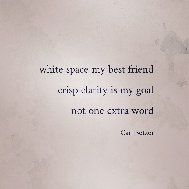 My Design Sensibility Posted on July 11, 2020 by Carl Setzer white space my best friend crisp clarity is my goal not one extra word Such is my ascetic: minimalism, concise clarity. Inspired by modernist and Swiss Style, I prefer crisp fonts, lots of free, open white space. Share this: Click to share on X (Opens in new window) X Click to share on Facebook (Opens in new window) Facebook Click to share on Tumblr (Opens in new window) Tumblr Click to share on Pinterest (Opens in new window) Pinterest Click to share on Reddit (Opens in new window) Reddit Like Loading... Related Published by Carl Setzer Writing haiku trying to figure out life View all posts by Carl Setzer