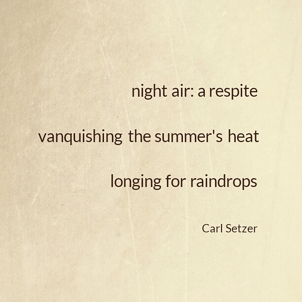 A Summer’s Night Haiku From Seattle Posted on July 28, 2020 by Carl Setzer night air: a respite vanquishing the summer’s heat longing for raindrops Share this: Click to share on X (Opens in new window) X Click to share on Facebook (Opens in new window) Facebook Click to share on Tumblr (Opens in new window) Tumblr Click to share on Pinterest (Opens in new window) Pinterest Click to share on Reddit (Opens in new window) Reddit Like Loading... Related Published by Carl Setzer Writing haiku trying to figure out life View all posts by Carl Setzer