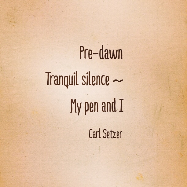 A pre-dawn haiku Posted on August 31, 2020 by Carl Setzer ​Pre-dawn Tranquil silence ~ My pen and I I love early mornings, before anyone else is awake. Share this: Click to share on X (Opens in new window) X Click to share on Facebook (Opens in new window) Facebook Click to share on Tumblr (Opens in new window) Tumblr Click to share on Pinterest (Opens in new window) Pinterest Click to share on Reddit (Opens in new window) Reddit Like Loading... Related Published by Carl Setzer Writing haiku trying to figure out life View all posts by Carl Setzer