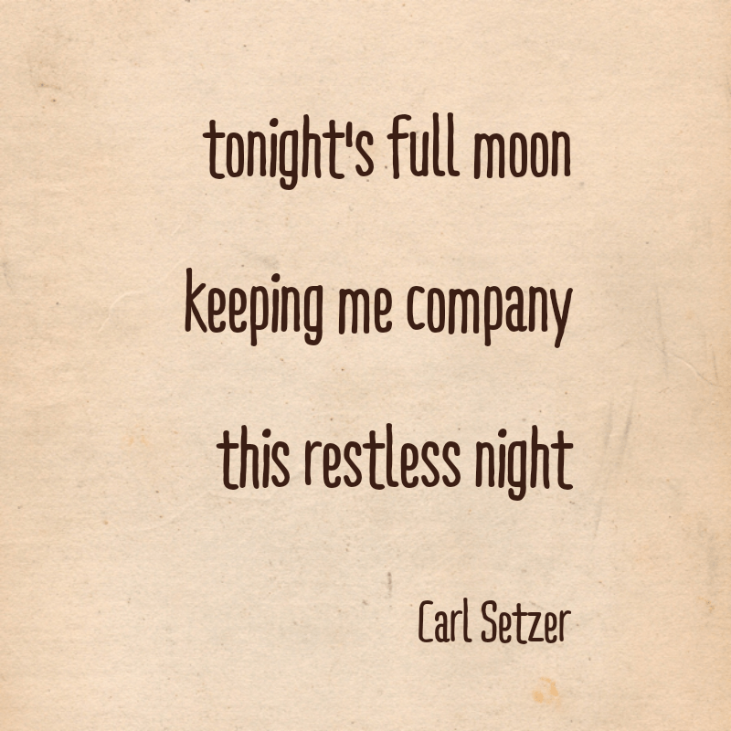Full Moon Haiku Posted on September 4, 2020September 4, 2020 by Carl Setzer tonight’s full moon keeping me company this restless night Edit: corrected spelling Share this: Click to share on X (Opens in new window) X Click to share on Facebook (Opens in new window) Facebook Click to share on Tumblr (Opens in new window) Tumblr Click to share on Pinterest (Opens in new window) Pinterest Click to share on Reddit (Opens in new window) Reddit Like Loading... Related Published by Carl Setzer Writing haiku trying to figure out life View all posts by Carl Setzer
