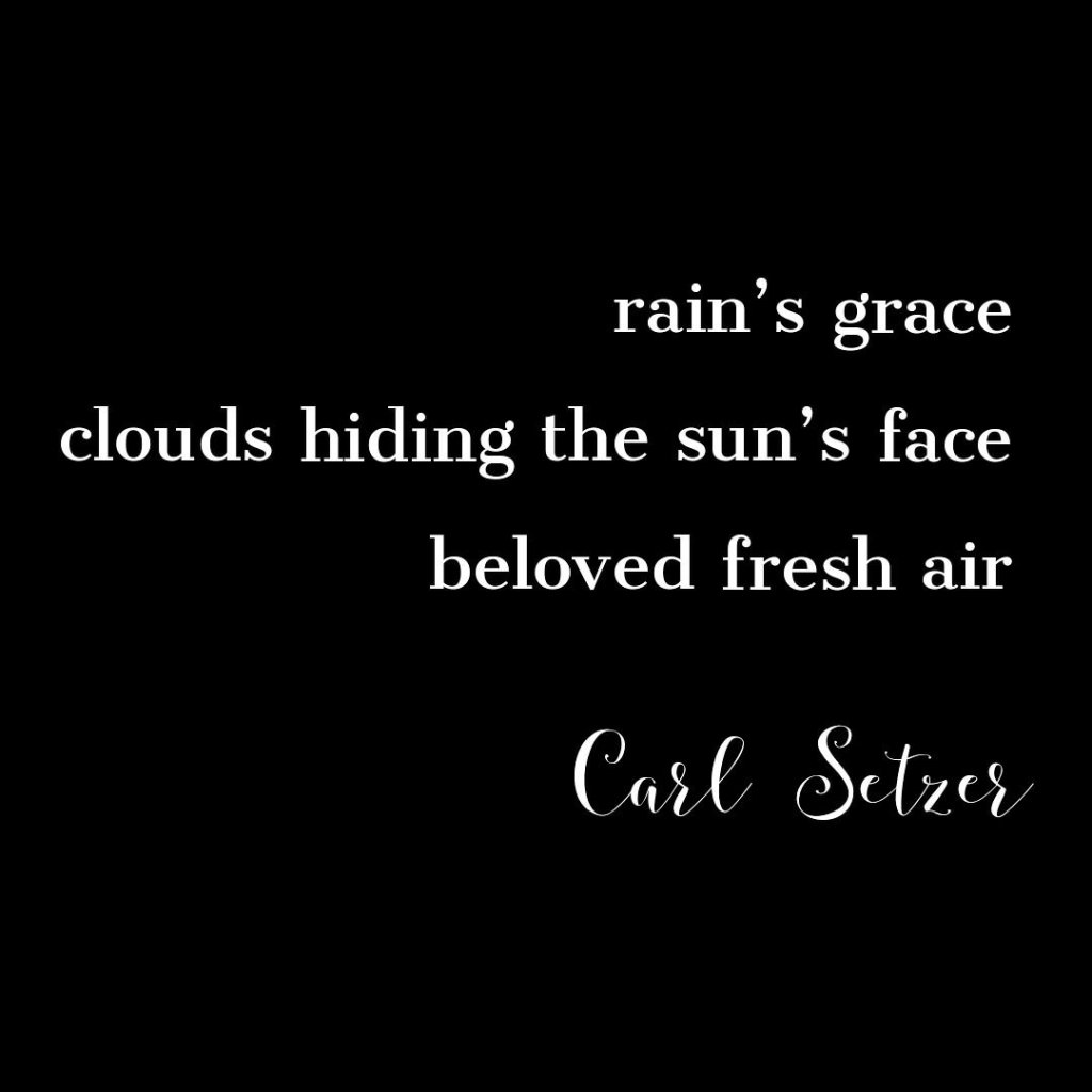 Blessed Rain Posted on September 19, 2020 by Carl Setzer rain’s graceclouds hiding the sun’s facebeloved fresh air Seattle’s rain is most welcome. Share this: Click to share on X (Opens in new window) X Click to share on Facebook (Opens in new window) Facebook Click to share on Tumblr (Opens in new window) Tumblr Click to share on Pinterest (Opens in new window) Pinterest Click to share on Reddit (Opens in new window) Reddit Like Loading... Related Published by Carl Setzer Writing haiku trying to figure out life View all posts by Carl Setzer