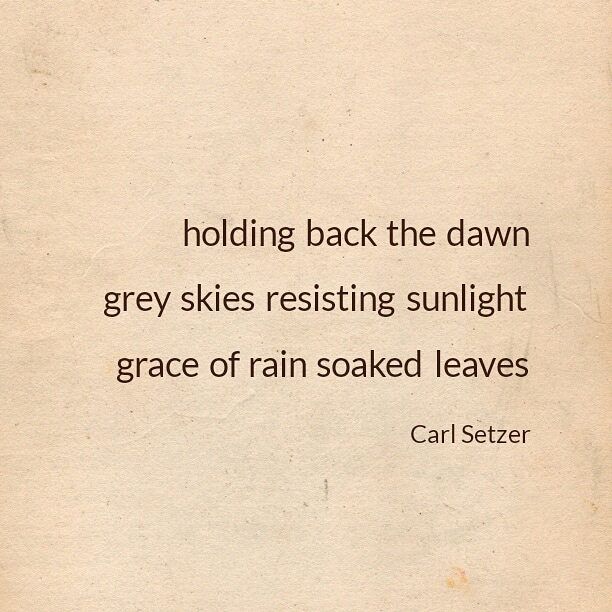 The First Day Of Autumn Posted on September 21, 2020 by Carl Setzer holding back the dawn grey skies resisting sunlight grace of rain soaked leaves It’s a classic Seattle autumn morning. One that I delight in. I hope your autumn is off to a good start. Share this: Click to share on X (Opens in new window) X Click to share on Facebook (Opens in new window) Facebook Click to share on Tumblr (Opens in new window) Tumblr Click to share on Pinterest (Opens in new window) Pinterest Click to share on Reddit (Opens in new window) Reddit Like Loading... Related Published by Carl Setzer Writing haiku trying to figure out life View all posts by Carl Setzer