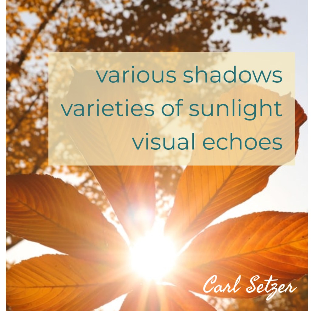 Visual Echoes Posted on October 19, 2020 by Carl Setzer Visual Echoes various shadowsvarieties of sunlightvisual echoes Created with Adobe Spark. Font: Montserrat Share this: Click to share on X (Opens in new window) X Click to share on Facebook (Opens in new window) Facebook Click to share on Tumblr (Opens in new window) Tumblr Click to share on Pinterest (Opens in new window) Pinterest Click to share on Reddit (Opens in new window) Reddit Like Loading... Related Published by Carl Setzer Writing haiku trying to figure out life View all posts by Carl Setzer