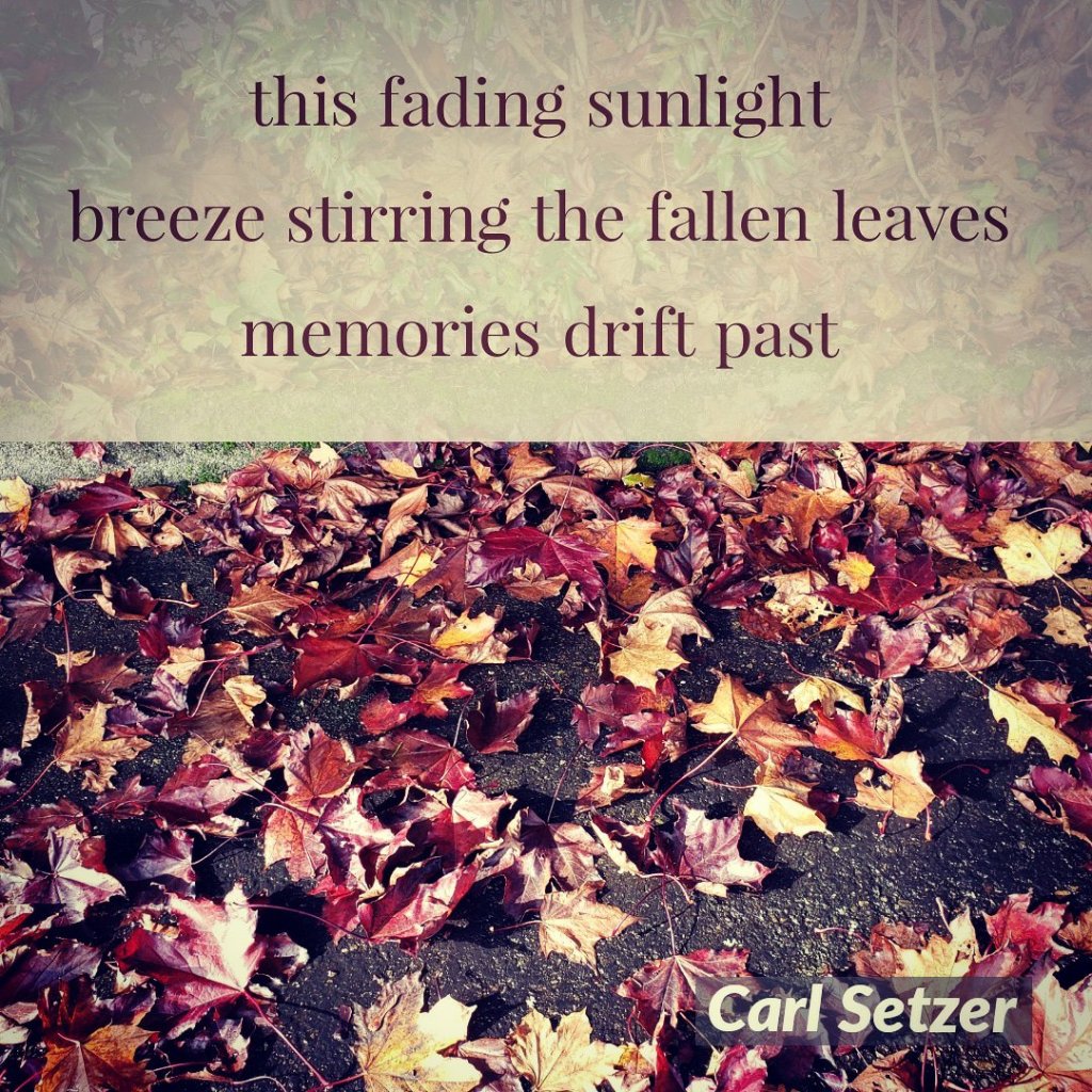 An Autumn Haiku Posted on October 23, 2020 by Carl Setzer this fading sunlightbreeze stirring the fallen leavesmemories drift past Share this: Click to share on X (Opens in new window) X Click to share on Facebook (Opens in new window) Facebook Click to share on Tumblr (Opens in new window) Tumblr Click to share on Pinterest (Opens in new window) Pinterest Click to share on Reddit (Opens in new window) Reddit Like Loading... Related Published by Carl Setzer Writing haiku trying to figure out life View all posts by Carl Setzer
