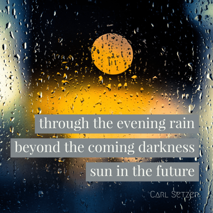 An Evening Haiku Posted on November 3, 2020November 3, 2020 by Carl Setzer through the evening rain beyond the coming darkness sun in the future Share this: Click to share on X (Opens in new window) X Click to share on Facebook (Opens in new window) Facebook Click to share on Tumblr (Opens in new window) Tumblr Click to share on Pinterest (Opens in new window) Pinterest Click to share on Reddit (Opens in new window) Reddit Like Loading... Related Published by Carl Setzer Writing haiku trying to figure out life View all posts by Carl Setzer