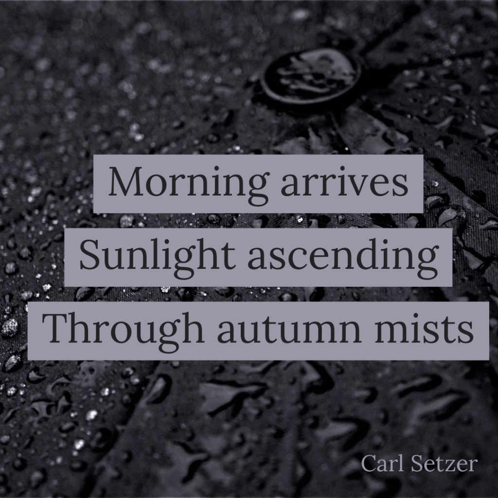 A rainy Monday Morning Posted on November 16, 2020 by Carl Setzer Rainy Monday morning haiku Morning arrivesSunlight ascendingThrough autumn mists Share this: Click to share on X (Opens in new window) X Click to share on Facebook (Opens in new window) Facebook Click to share on Tumblr (Opens in new window) Tumblr Click to share on Pinterest (Opens in new window) Pinterest Click to share on Reddit (Opens in new window) Reddit Like Loading... Related Published by Carl Setzer Writing haiku trying to figure out life View all posts by Carl Setzer