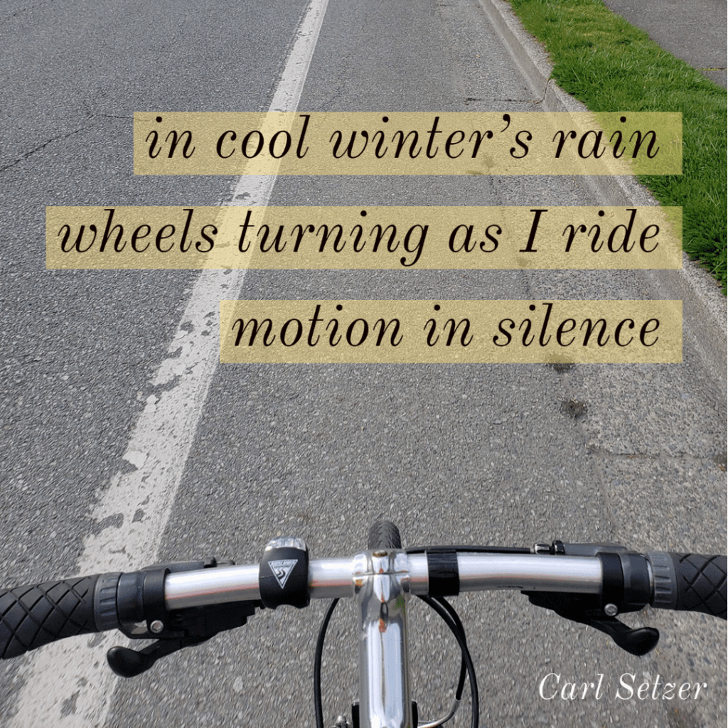 Ride: A Haiku Posted on February 17, 2021 by Carl Setzer Ride: A Haiku in cool winter’s rainwheels turning as I ridemotion in silence Share this: Click to share on X (Opens in new window) X Click to share on Facebook (Opens in new window) Facebook Click to share on Tumblr (Opens in new window) Tumblr Click to share on Pinterest (Opens in new window) Pinterest Click to share on Reddit (Opens in new window) Reddit Like Loading... Related Published by Carl Setzer Writing haiku trying to figure out life View all posts by Carl Setzer
