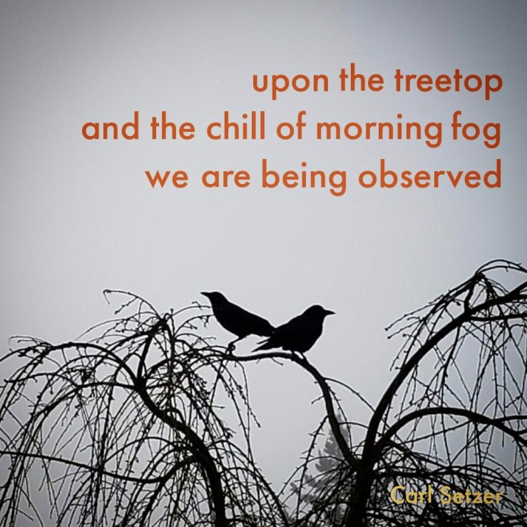 Posted on March 4, 2021 by Carl Setzer A morning haiku upon the treetopand the chill of morning fogwe are being observed Moving slowly from winter to spring. A foggy morning, rains arriving later, shortly after the air warms in spring sunlight. Share this: Click to share on X (Opens in new window) X Click to share on Facebook (Opens in new window) Facebook Click to share on Tumblr (Opens in new window) Tumblr Click to share on Pinterest (Opens in new window) Pinterest Click to share on Reddit (Opens in new window) Reddit Like Loading... Related Published by Carl Setzer Writing haiku trying to figure out life View all posts by Carl Setzer