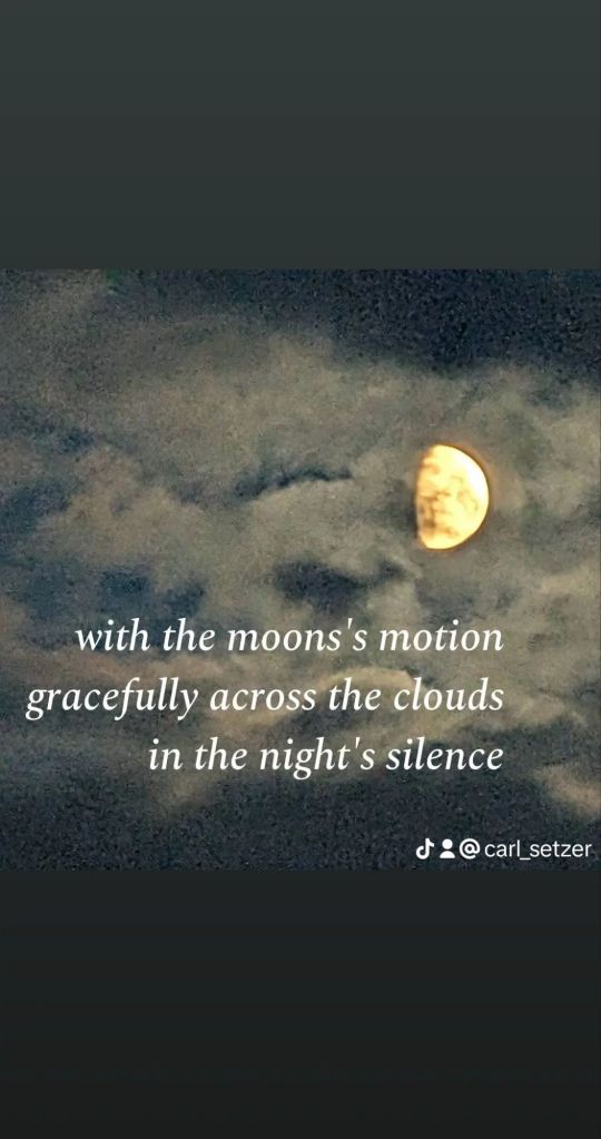 Tonight’s haiku Posted on September 14, 2024 by Carl Setzer with the moons’s motiongracefully across the cloudsin the night’s silence Share this: Share on X (Opens in new window) X Share on Facebook (Opens in new window) Facebook Share on Tumblr (Opens in new window) Tumblr Share on Pinterest (Opens in new window) Pinterest Share on Reddit (Opens in new window) Reddit Like Loading... Related Published by Carl Setzer Haiku View all posts by Carl Setzer