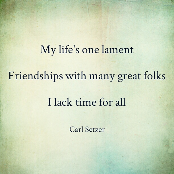 A challenge in my life September 9, 2016 Carl SetzerLeave a comment My life’s one lament Friendships with many great folks I lack time for all Share this: Share on X (Opens in new window) X Share on Facebook (Opens in new window) Facebook Share on Tumblr (Opens in new window) Tumblr Share on Pinterest (Opens in new window) Pinterest Share on Reddit (Opens in new window) Reddit Like Loading...
