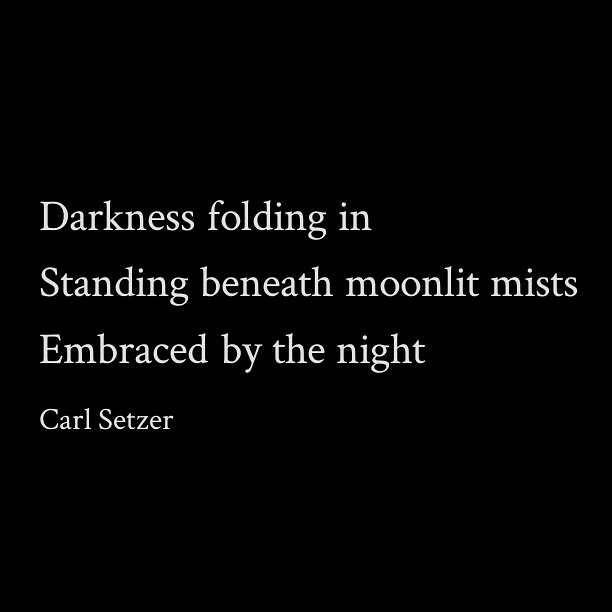 On a moonlit night February 10, 2017 Carl SetzerLeave a comment Darkness folding in Standing beneath moonlit mists Embraced by the night Share this: Click to share on X (Opens in new window) X Click to share on Facebook (Opens in new window) Facebook Click to share on Tumblr (Opens in new window) Tumblr Click to share on Pinterest (Opens in new window) Pinterest Click to share on Reddit (Opens in new window) Reddit Like Loading...