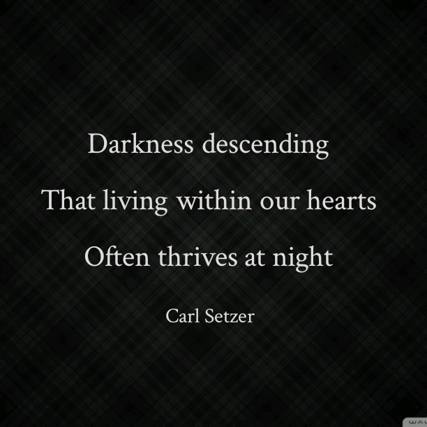 Darkness Descending February 1, 2017 Carl SetzerLeave a comment Darkness descending That living within our hearts Often thrives at night Share this: Click to share on X (Opens in new window) X Click to share on Facebook (Opens in new window) Facebook Click to share on Tumblr (Opens in new window) Tumblr Click to share on Pinterest (Opens in new window) Pinterest Click to share on Reddit (Opens in new window) Reddit Like Loading...