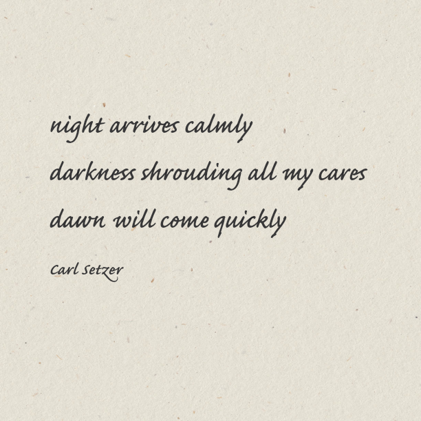 Night arrives April 13, 2017 Carl SetzerLeave a comment night arrives calmly darkness shrouding all my cares dawn will come quickly Share this: Click to share on X (Opens in new window) X Click to share on Facebook (Opens in new window) Facebook Click to share on Tumblr (Opens in new window) Tumblr Click to share on Pinterest (Opens in new window) Pinterest Click to share on Reddit (Opens in new window) Reddit Like Loading...