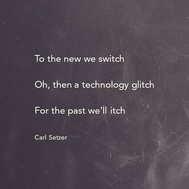 Oh Technology: A Haiku April 30, 2017May 5, 2017 Carl SetzerLeave a comment To the new we switch Oh, then a technology glitch For the past we’ll itch Share this: Click to share on X (Opens in new window) X Click to share on Facebook (Opens in new window) Facebook Click to share on Tumblr (Opens in new window) Tumblr Click to share on Pinterest (Opens in new window) Pinterest Click to share on Reddit (Opens in new window) Reddit Like Loading...
