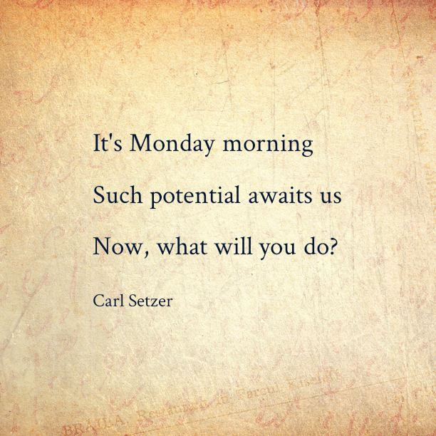 A #MondayMotivation #Haiku For You March 18, 2019 Carl Setzer2 Comments It’s Monday morning Such potential awaits us Now, what will you do? Carpet diem, as the adage goes. Seize this day! What will you make of it? I hope something grand. Share this: Click to share on X (Opens in new window) X Click to share on Facebook (Opens in new window) Facebook Click to share on Tumblr (Opens in new window) Tumblr Click to share on Pinterest (Opens in new window) Pinterest Click to share on Reddit (Opens in new window) Reddit Like Loading...