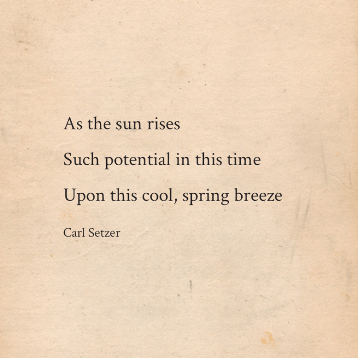The Potential Of A #Monday: A #Haiku May 13, 2019 Carl SetzerLeave a comment As the sun rises Such potential in this time Upon this cool, spring breeze Share this: Click to share on X (Opens in new window) X Click to share on Facebook (Opens in new window) Facebook Click to share on Tumblr (Opens in new window) Tumblr Click to share on Pinterest (Opens in new window) Pinterest Click to share on Reddit (Opens in new window) Reddit Like Loading...