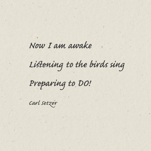 A Monday Motivational Haiku May 21, 2018 Carl SetzerLeave a comment Now I am awake Listening to the birds sing Preparing to DO! Time to move, to grow, act and move. Go and DO something you can brag about. Share this: Click to share on X (Opens in new window) X Click to share on Facebook (Opens in new window) Facebook Click to share on Tumblr (Opens in new window) Tumblr Click to share on Pinterest (Opens in new window) Pinterest Click to share on Reddit (Opens in new window) Reddit Like Loading...