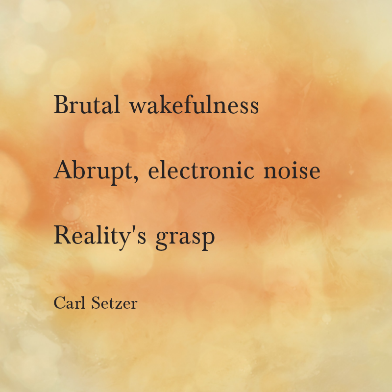 Good Morning: A Haiku December 19, 2017 Carl SetzerLeave a comment Brutal wakefulness Abrupt, electronic noise Reality’s grasp Between fans blowing, my phone pinging, and alarms chiming, my morning is filled with racket. Share this: Click to share on X (Opens in new window) X Click to share on Facebook (Opens in new window) Facebook Click to share on Tumblr (Opens in new window) Tumblr Click to share on Pinterest (Opens in new window) Pinterest Click to share on Reddit (Opens in new window) Reddit Like Loading...