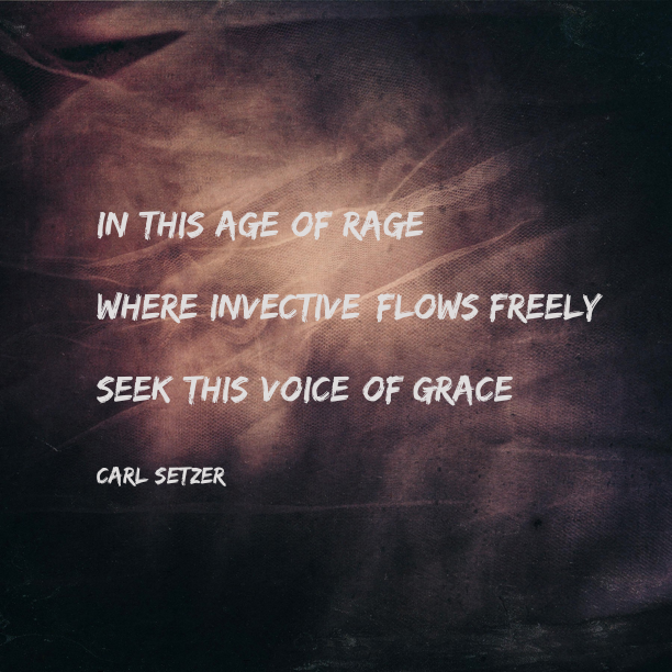 This Age of Rage: A Haiku June 24, 2018 Carl Setzer5 Comments In this age of rage Where invective flows freely Seek this voice of grace Share this: Click to share on X (Opens in new window) X Click to share on Facebook (Opens in new window) Facebook Click to share on Tumblr (Opens in new window) Tumblr Click to share on Pinterest (Opens in new window) Pinterest Click to share on Reddit (Opens in new window) Reddit Like Loading...