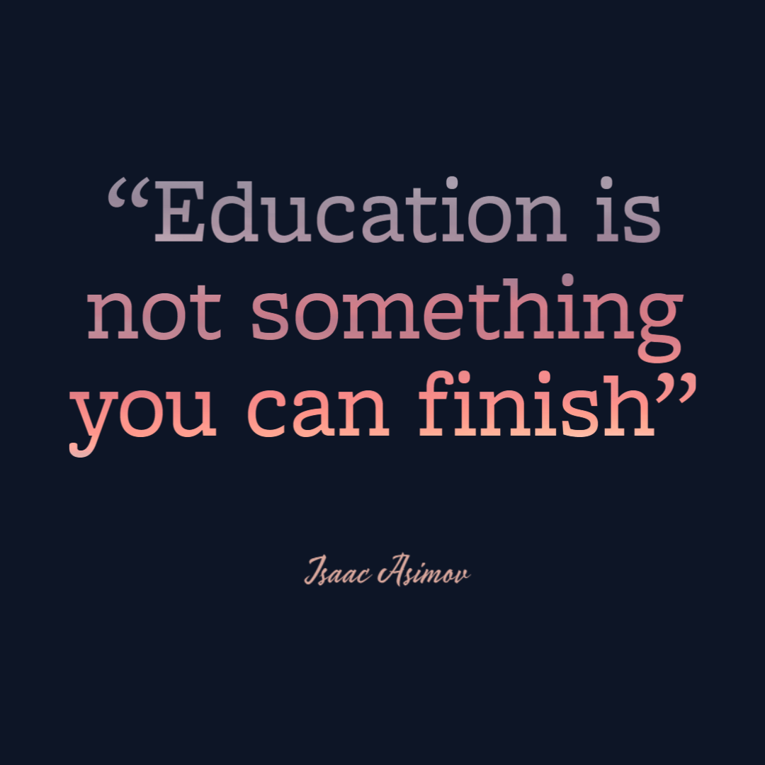 An Asimov Quote For Your Friday November 27, 2020 Carl SetzerLeave a comment “Education is not something you can finish” ~Isaac Asimov Dr. Asimov’s work had a profound impact on me. I fully embrace everything that this quote entrails. Continued learning is key to a vibrant life. Share this: Click to share on X (Opens in new window) X Click to share on Facebook (Opens in new window) Facebook Click to share on Tumblr (Opens in new window) Tumblr Click to share on Pinterest (Opens in new window) Pinterest Click to share on Reddit (Opens in new window) Reddit Like Loading...