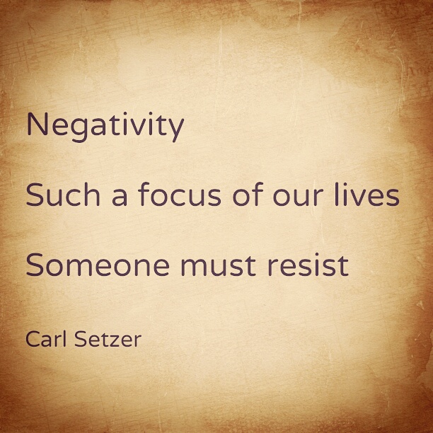 Positivity November 23, 2016 Carl SetzerLeave a comment Negativity Such a focus of our lives Someone must resist Share this: Click to share on X (Opens in new window) X Click to share on Facebook (Opens in new window) Facebook Click to share on Tumblr (Opens in new window) Tumblr Click to share on Pinterest (Opens in new window) Pinterest Click to share on Reddit (Opens in new window) Reddit Like Loading...