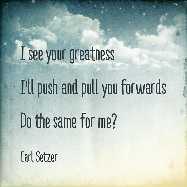 Seeing your greatness March 9, 2017 Carl SetzerLeave a comment I see your greatness I’ll push and pull you forwards Do the same for me? Share this: Click to share on X (Opens in new window) X Click to share on Facebook (Opens in new window) Facebook Click to share on Tumblr (Opens in new window) Tumblr Click to share on Pinterest (Opens in new window) Pinterest Click to share on Reddit (Opens in new window) Reddit Like Loading...