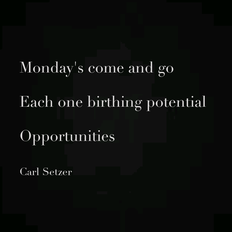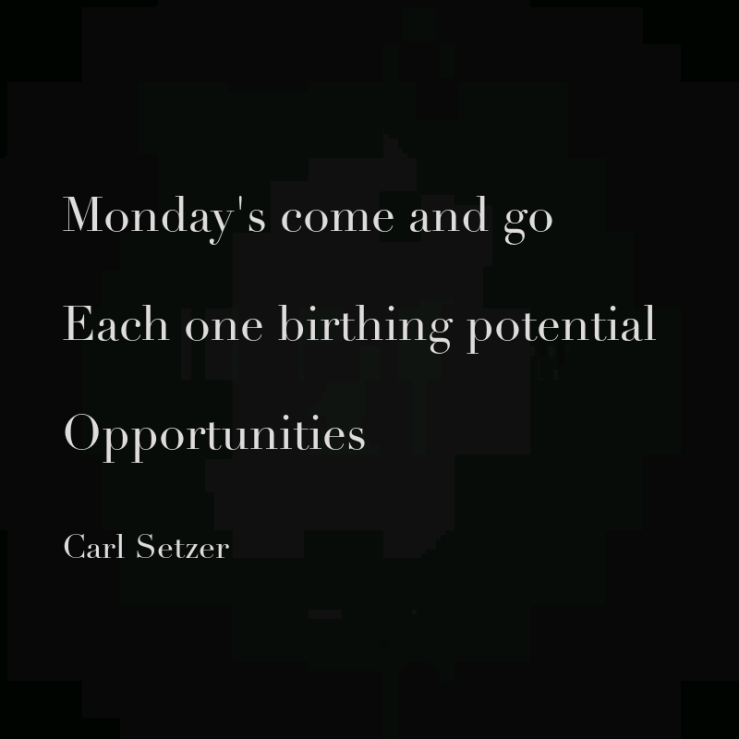 Another #Monday #Motivational #HaikuĀ August 28, 2017 Carl SetzerLeave a comment Monday’s come and go Each one birthing potential Opportunities Share this: Click to share on X (Opens in new window) X Click to share on Facebook (Opens in new window) Facebook Click to share on Tumblr (Opens in new window) Tumblr Click to share on Pinterest (Opens in new window) Pinterest Click to share on Reddit (Opens in new window) Reddit Like Loading...