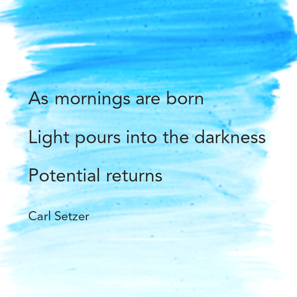 The power of dawn November 8, 2017 Carl SetzerLeave a comment As mornings are born Light pours into the darkness Potential returns Mornings have great power, setting the tone for the day. Share this: Click to share on X (Opens in new window) X Click to share on Facebook (Opens in new window) Facebook Click to share on Tumblr (Opens in new window) Tumblr Click to share on Pinterest (Opens in new window) Pinterest Click to share on Reddit (Opens in new window) Reddit Like Loading...