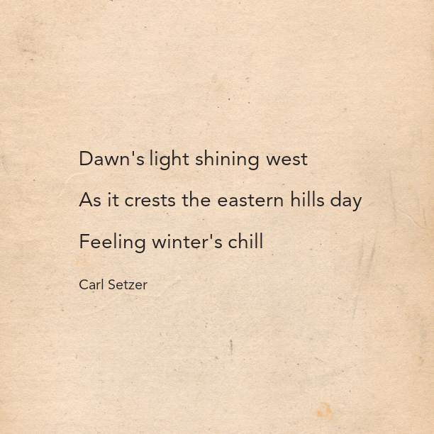 December 26, 2018 Carl SetzerLeave a comment Dawn’s light shining west As it crests the eastern hills day Feeling winter’s chill I love dawn. I always feel deep potential. The possibilities feel endless. Share this: Click to share on X (Opens in new window) X Click to share on Facebook (Opens in new window) Facebook Click to share on Tumblr (Opens in new window) Tumblr Click to share on Pinterest (Opens in new window) Pinterest Click to share on Reddit (Opens in new window) Reddit Like Loading...