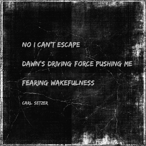 Fearing wakefulness February 22, 2017 Carl SetzerLeave a comment No I can’t escape Dawn’s driving force pushing me Fearing wakefulness Share this: Click to share on X (Opens in new window) X Click to share on Facebook (Opens in new window) Facebook Click to share on Tumblr (Opens in new window) Tumblr Click to share on Pinterest (Opens in new window) Pinterest Click to share on Reddit (Opens in new window) Reddit Like Loading...