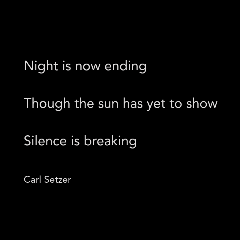 Birds Awakened April 1, 2018April 1, 2018 Carl SetzerLeave a comment This morning’s still dark Abrupt noise into silence Birds have awakened This morning’s first birdsong came while I was dosing. Jarring enough to yank my attention. Does the first bird to speak get the early worm? Ot, perhaps, he gets the girl? Share this: Click to share on X (Opens in new window) X Click to share on Facebook (Opens in new window) Facebook Click to share on Tumblr (Opens in new window) Tumblr Click to share on Pinterest (Opens in new window) Pinterest Click to share on Reddit (Opens in new window) Reddit Like Loading...