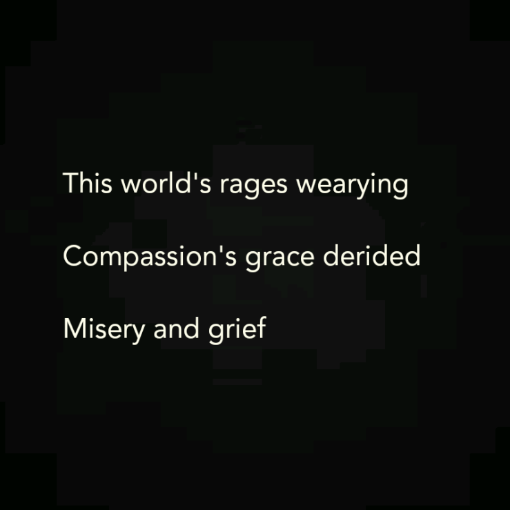 The world afire in rage August 12, 2017 Carl SetzerLeave a comment This world’s rages wearying Compassion’s grace derided Misery and grief Share this: Click to share on X (Opens in new window) X Click to share on Facebook (Opens in new window) Facebook Click to share on Tumblr (Opens in new window) Tumblr Click to share on Pinterest (Opens in new window) Pinterest Click to share on Reddit (Opens in new window) Reddit Like Loading...